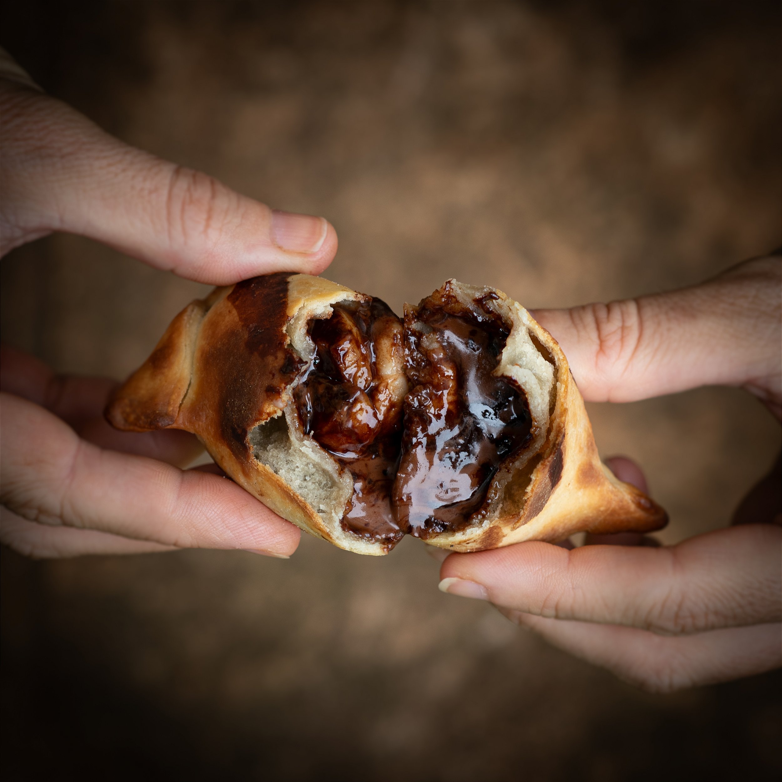 Empanada recheada com chocolate, banana nanica e pralinee de avelã